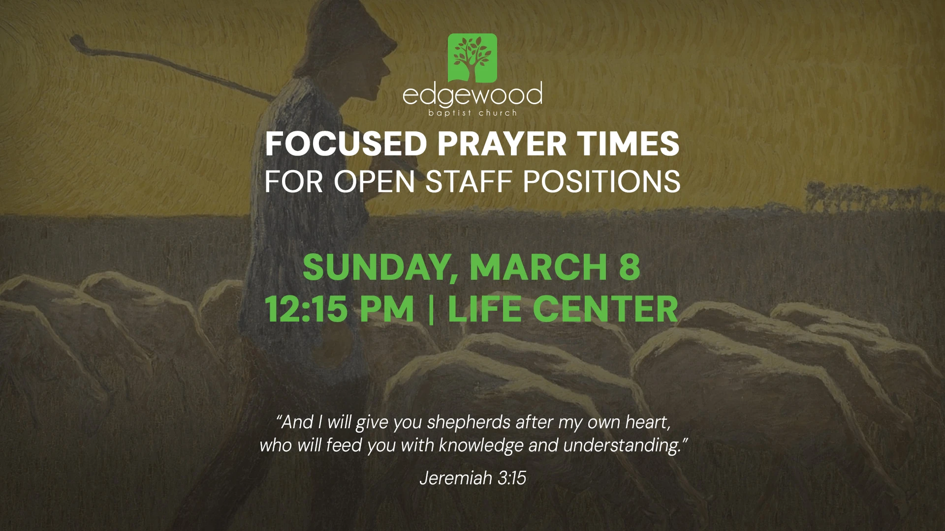 As the Vanderbloemen search team works diligently to identify candidates for the Celebrate Recovery and Counseling Pastor and the Young Adults Pastor positions, we place our trust fully in the Lord to provide the right leaders. Our task is to seek the Lord and to pray for God’s provision for these pastoral positions. Join us as we gather for a focused time of prayer.